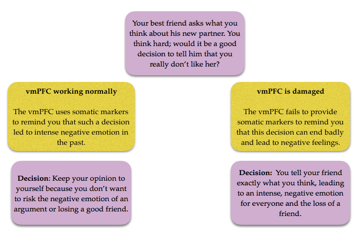 Damasio began to wonder if damage to the vmPFC somehow caused patients to lose a connection between emotional information and their decision-making. The vmPFC seems to be involved in somatic markers of emotions associated with thoughts and memories. Somatic markers are feelings in the body that are associated with emotions, such as the association of rapid heartbeat with anxiety or of nausea with disgust. Domasio wondered what would happen if this layer of information was removed when we try to decide what to do in a difficult situation.