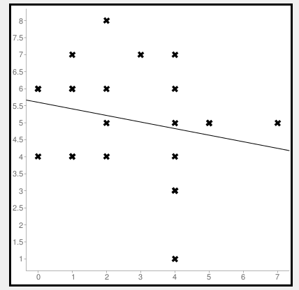 As you can see from the graph and the line of best fit, there is a very minimal link between the two variables. In order to actually see the level of correlational, click on the "correlation coefficient." This is a calculation of the Pearson's r test. When I do my calculation, I find that the correlational coefficient for my data is r = -0.23. This means two things. A value of 1.0 would mean a very strong correlation - that is, that those that know more about exercise do more exercise. In this case, it is only .23. So there is only a very weak correlation. Secondly, you can see the negative sign. This indicates the direction of the correlation. In this case, it appears that there is a very slight correlation in the direction that those that exercise more know less about the health benefits.