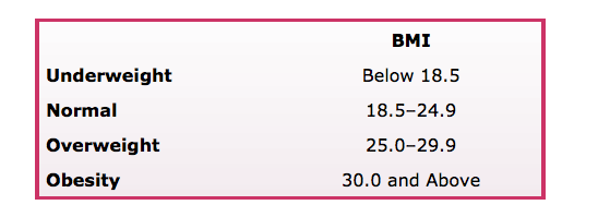 BMI = Weight (in kg.) / Height (in meters) Squared (ht. x ht).