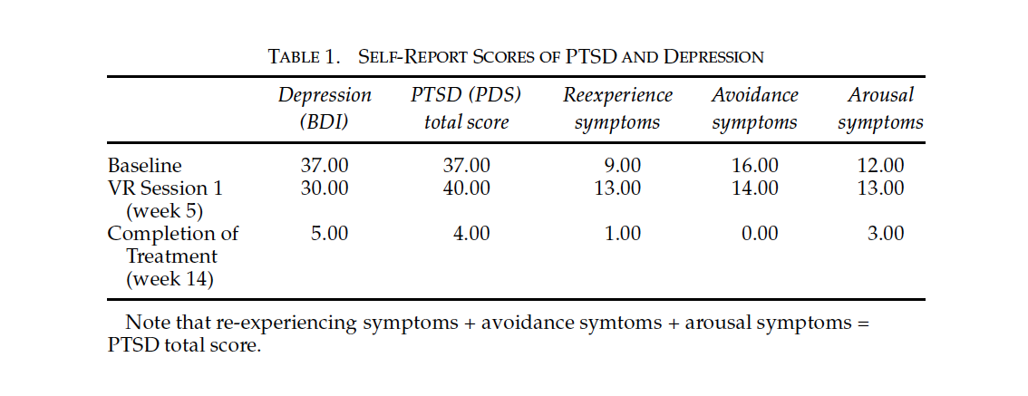 Rizzo et al (2012) carried out a study of the effectiveness of VRET on 20 active-duty service members (mean age of 28). After eleven sessions, 16 of the 20 participants no longer met a diagnosis for PTSD and there was an average 50 percent decrease in symptoms among the remainder of the sample. In a follow-up to the study, the participants remained free of PTSD symptoms three months later. Self-reports from the participants suggested that they had seen an improvement in their quality of life.