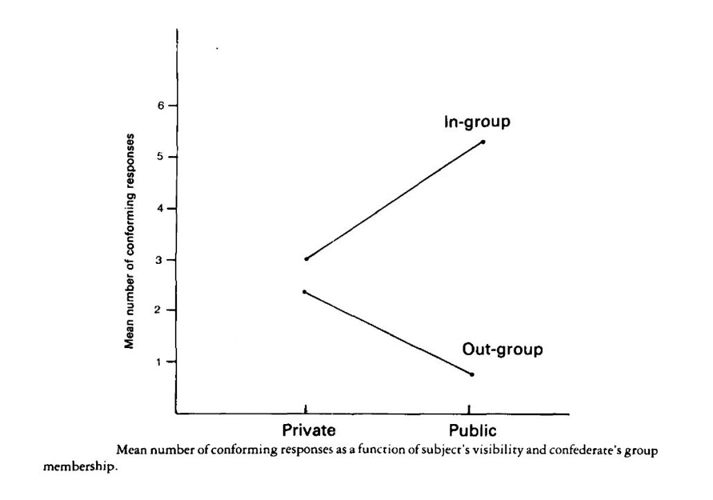 The results seem to indicate that social categorization can play a key role in one’s decision to conform publicly. When compared to Asch’s original findings, the overall conformity levels are about the same. But when we consider social categorization, public conformity exceeded the usual level in the in-group condition but was far below normal in the out-group condition. The explanation for this, from self-categorization theory, is that we tend to exaggerate the difference between us and the out-group, while feeling that members of our own group share a common set of traits. Thus, in this experiment, in-group members may be seen as more correct, while out-group members are seen as less likely to be correct when participants are made conscious of their group membership.