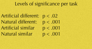 As would be expected, the least difference between the two groups was on the artificial different task. This is the task on which the white Australian children scored the highest. The Indigenous Australian children showed no significant difference whether the task was "artificial" or "natural." This means that the objects themselves did not affect the results of the study.