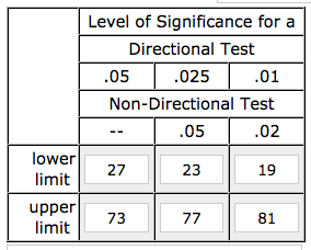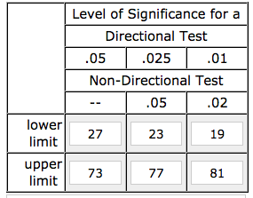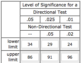 This is a directional test. Notice that your value of 88 is greater than the value of 86 (for 0.05) and less than the value of 91 (for 0.025). The statement of significance would read: The U value of 88 exceeds the critical value of 86 for p < 0.05. The null hypothesis is rejected. There is less than a 5% chance that our results are due only to chance. It appears that activating a schema prior to memorizing a list of words helps participants to remember more words from the list.