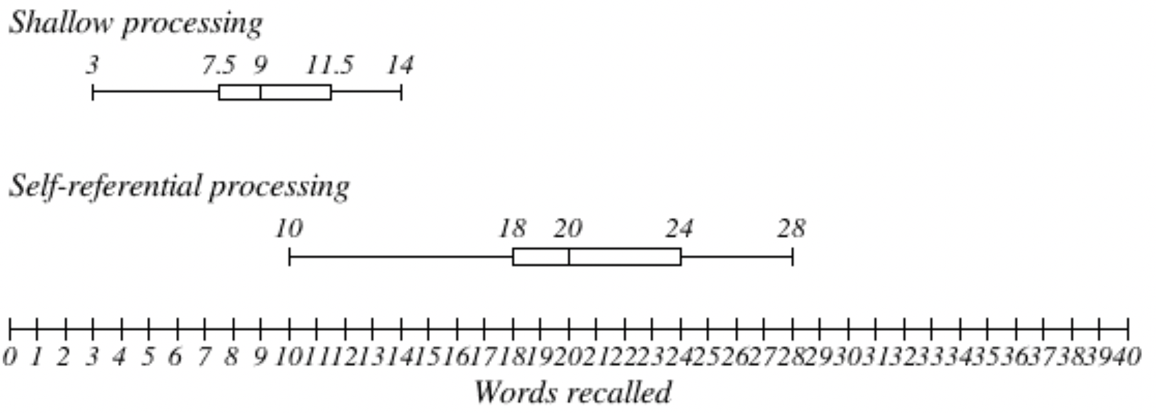The boxplots above show that the data is not overlapping in the two conditions. The median for the shallow processing group is 9.0 and 20.0 for the self-referential group. The IQR is very similar for the two conditions, with 4.0 for the shallow and 6.0 for the self-referential condition. In addition, we can see in both conditions that the data tends to skew toward the right, showing a higher variation of recall above the median than below the median.