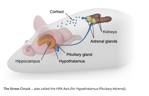 Here is an image of the rat's stress circuit. When the rat is stressed, stress signals travel from the hypothalamus to the pituitary gland and then to the adrenal glands. The adrenal glands then release the hormone cortisol. Cortisol is released from the adrenal glands and travels to hippocampus, where it binds to glucocorticoid receptor sites. When cells in the hippocampus detect cortisol, which binds to the receptor sites, a message is sent to the hypothalamus that shuts down the Fight of Flight response.