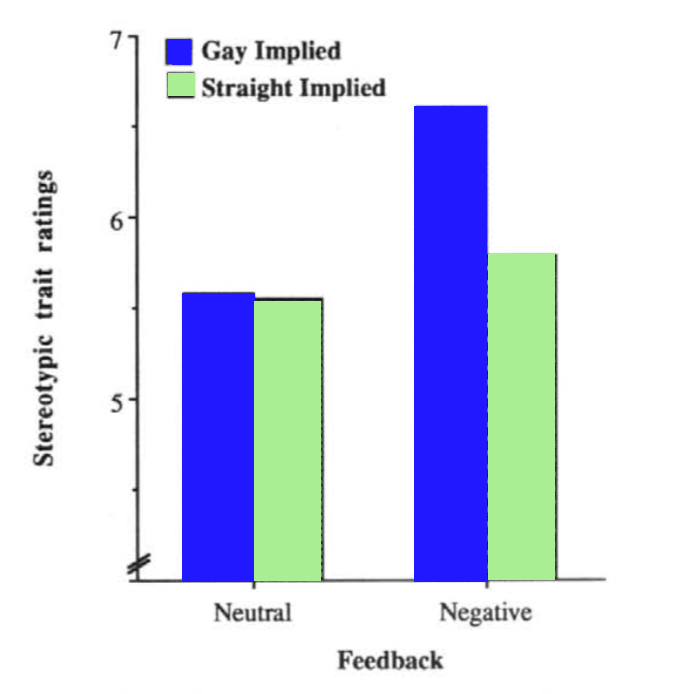 The researchers found that participants who had received negative feedback on the intelligence test rated the "gay implied" man more stereotypically than did the participants who did not receive feedback. They also rated themselves as less likely to "like" Gregg or what to be his friend than those in the neutral condition - regardless whether he was "gay implied" or "straight implied." However, the dislike was strongest in the "gay implied" condition.