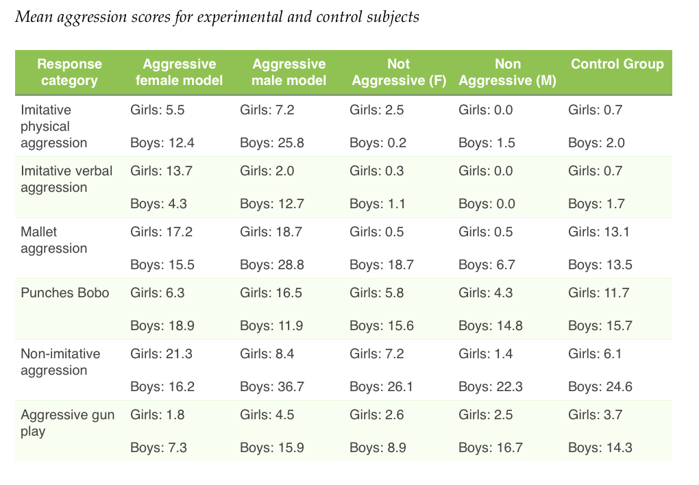 In addition, they recorded three types of aggressive behaviour that were not imitation of the adult model: punching Bobo, non-imitative physical and verbal aggression and aggressive gun play.