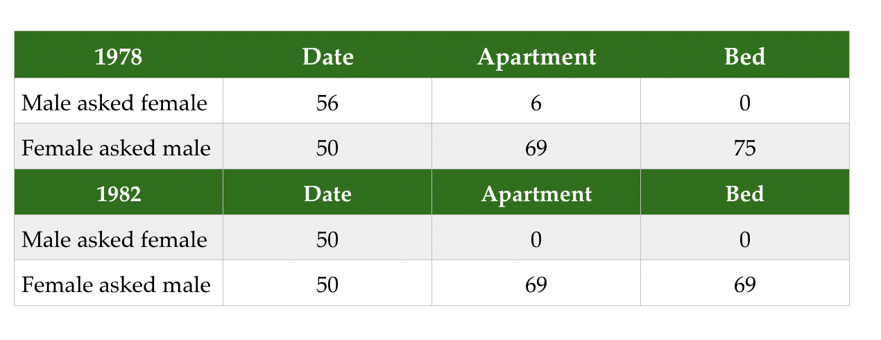Notice that although in both cases roughly 70% of the men were willing to have casual sex, in both experiments, none of the women agreed to do so. Analysis of the results found that the level of attractiveness of the confederate and no significant impact on the response from the participant.