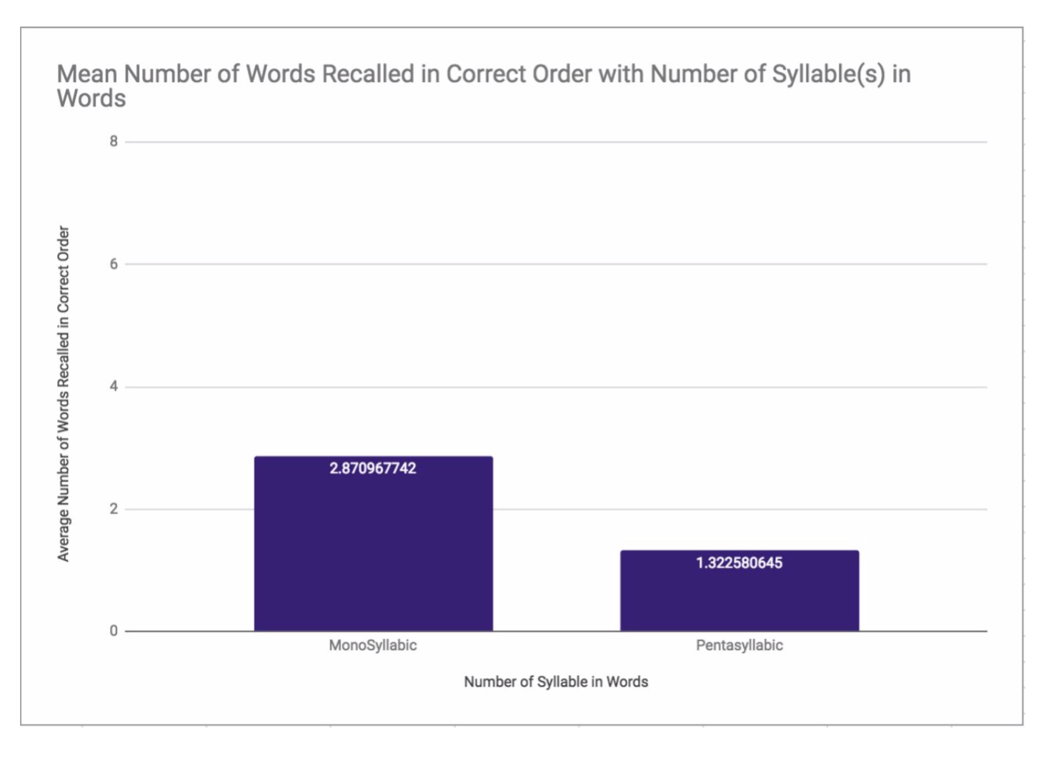 From our study, we are able to conclude that the number of syllables in words directly affects the number of words successfully recalled, with monosyllabic words recalled at a significantly higher rate.