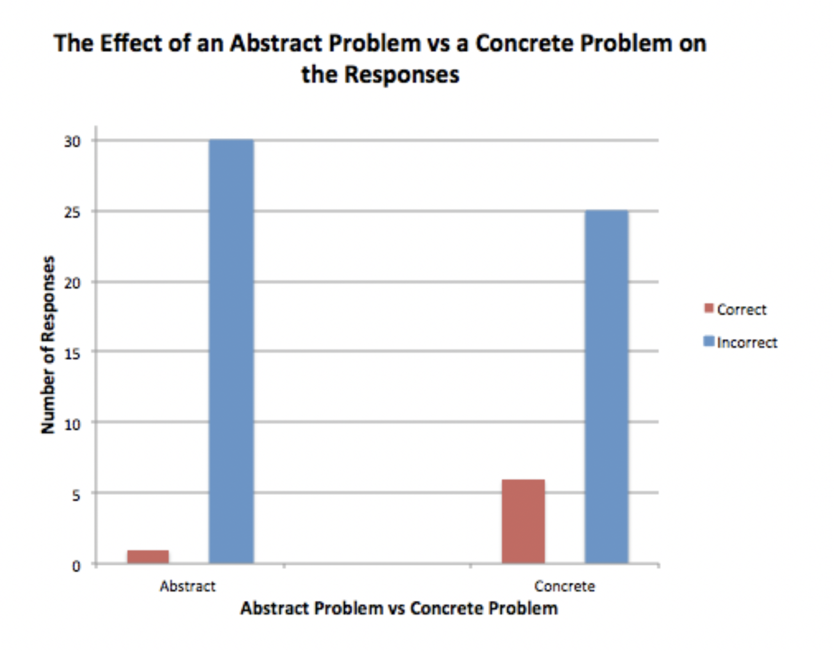 Since our data was nominal and our design was repeated measures, a Mcnemar chi-square test was used (see appendix VI) was used to determine whether the difference in the frequency of correct responses was significant. The test showed that the data was significant at p ≤ 0.001, meaning the null hypothesis can be rejected, and the research hypothesis accepted. It seems that the way in which a problem is presented (abstract or concrete) can play a significant role in the ability of international high school students to solve the problem.