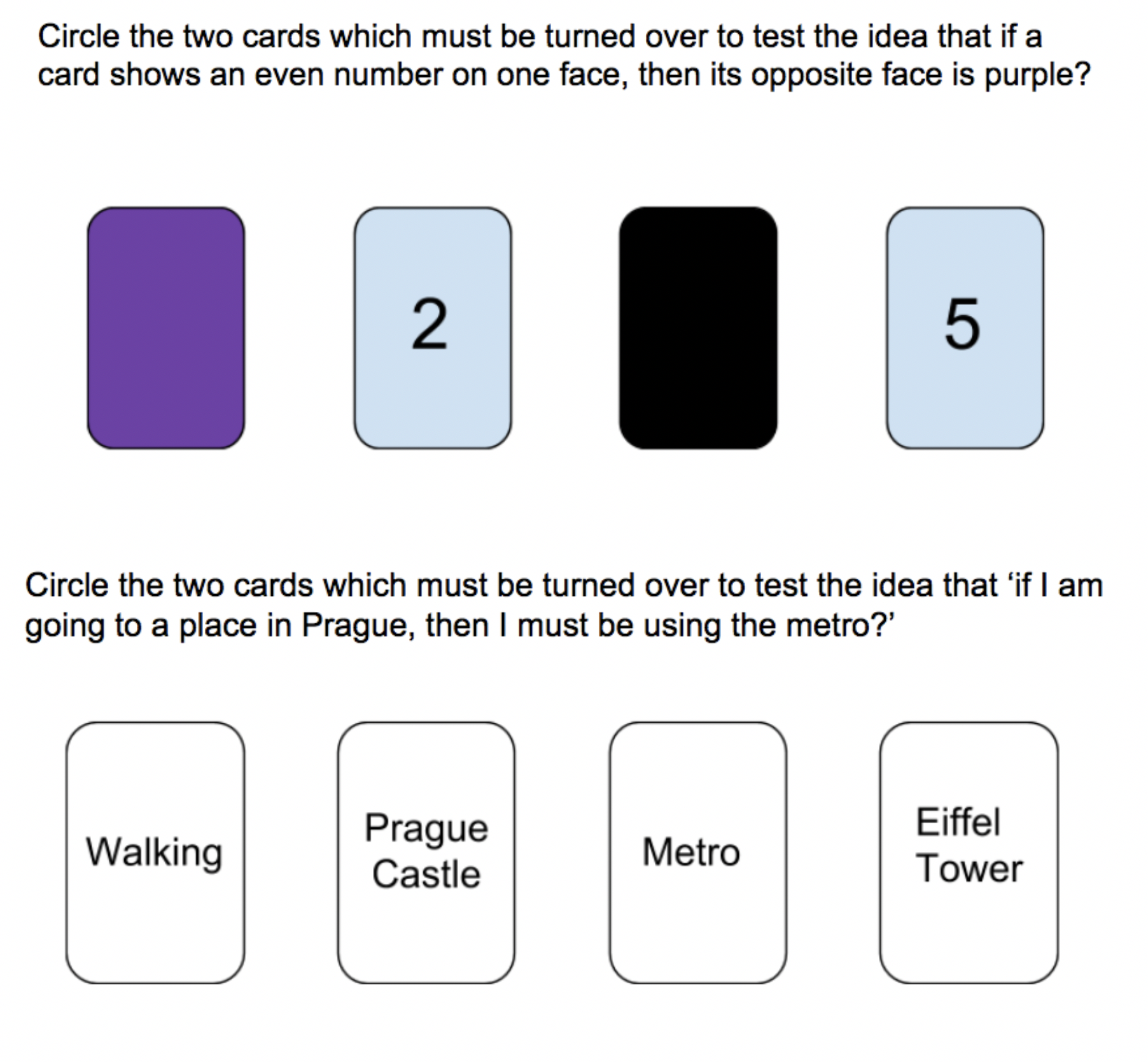 We created a slip of paper for each participant where on one side was the abstract problem and on the other was the concrete problem (see appendix I). The rule for each of the problems was above an image of 4 different cards. The participants would be asked to circle two of the cards to test the rule. We presented the rules above the cards in hopes of reducing the variable of a participant simply not remembering the rule presented, thus circling random cards. All participants were given the same papers, at the same sizes. The rules we created were similar to the ones given in the original study, but the concrete rule was tweaked to be more related and understandable to the sample used. Instead of using ‘Manchester’ as a part of the rule, ‘Prague’ was used, ensuring that all participants in the sample were familiar with the city and its modes of transportation.