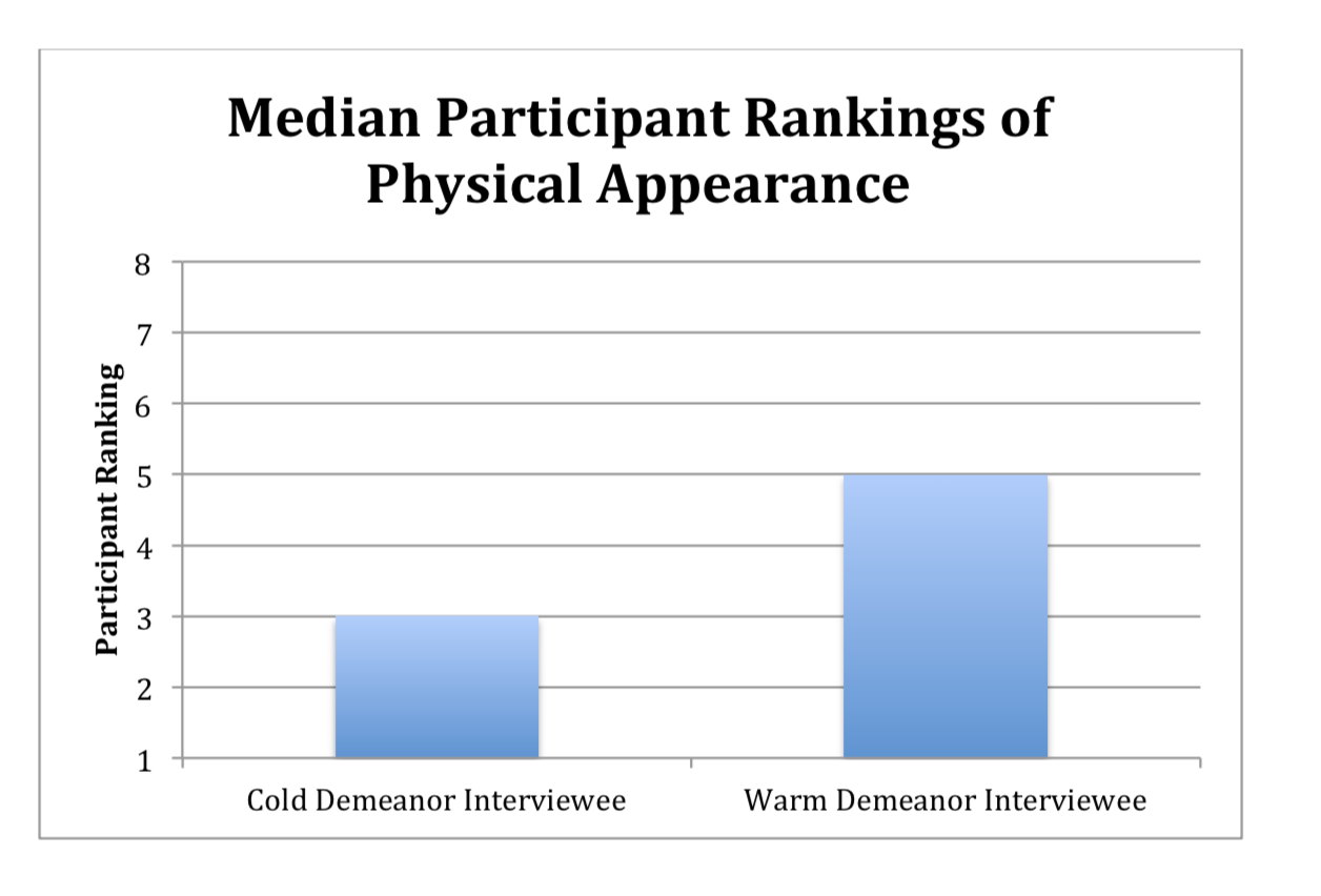 The data shows participants ranked the warm demeanor teacher as more physically attractive than the cold demeanor teacher.