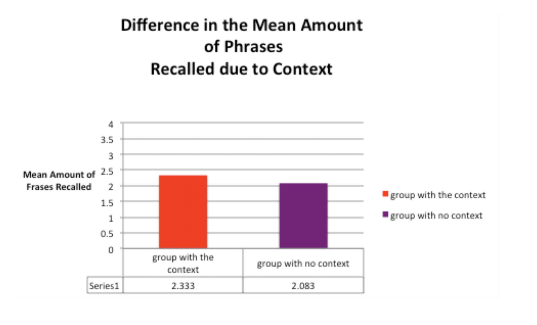 The results which we achieved are rather different compared with the results of the original Bransford & Johnson (1972) study. As mentioned in the writing above, the difference in results between the group with context compared to the group without context is barely evident. The mean number of phrases recalled is basically the same for both groups and it seems that the addition of context did not effectively influence the participants' ability to recall the presented information.