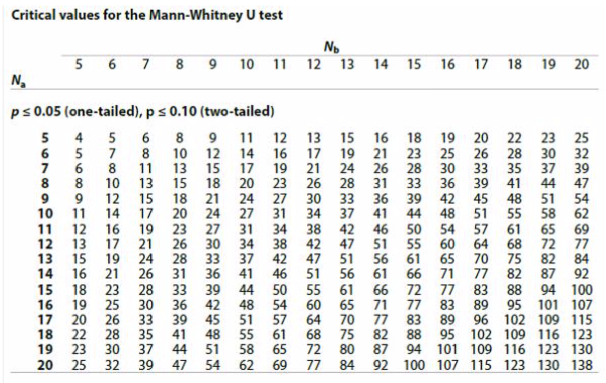 The numbers going down the left-hand column indicate the sample size of n1 (the larger group, 12). The numbers going across the top are for n2 (the smaller group, 10). For the significance level of p ≤ 0.05 for a one-tailed test, the U value must be less than 34. Since our U value is 38.5, we can say that our data is not significant.
