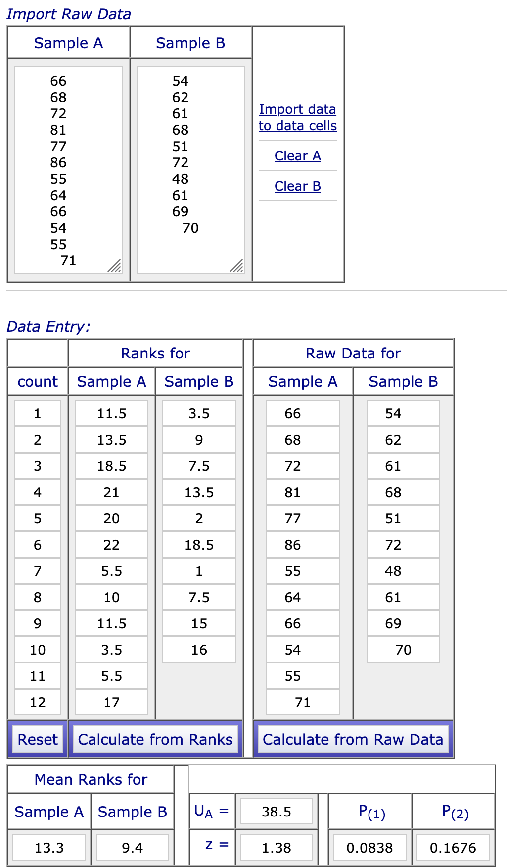 To calculate the level of significance, we can use the program Vasserstats.net. To calculate the Mann Whitney U Test, click on "Ordinal Data" in the left-hand margin.