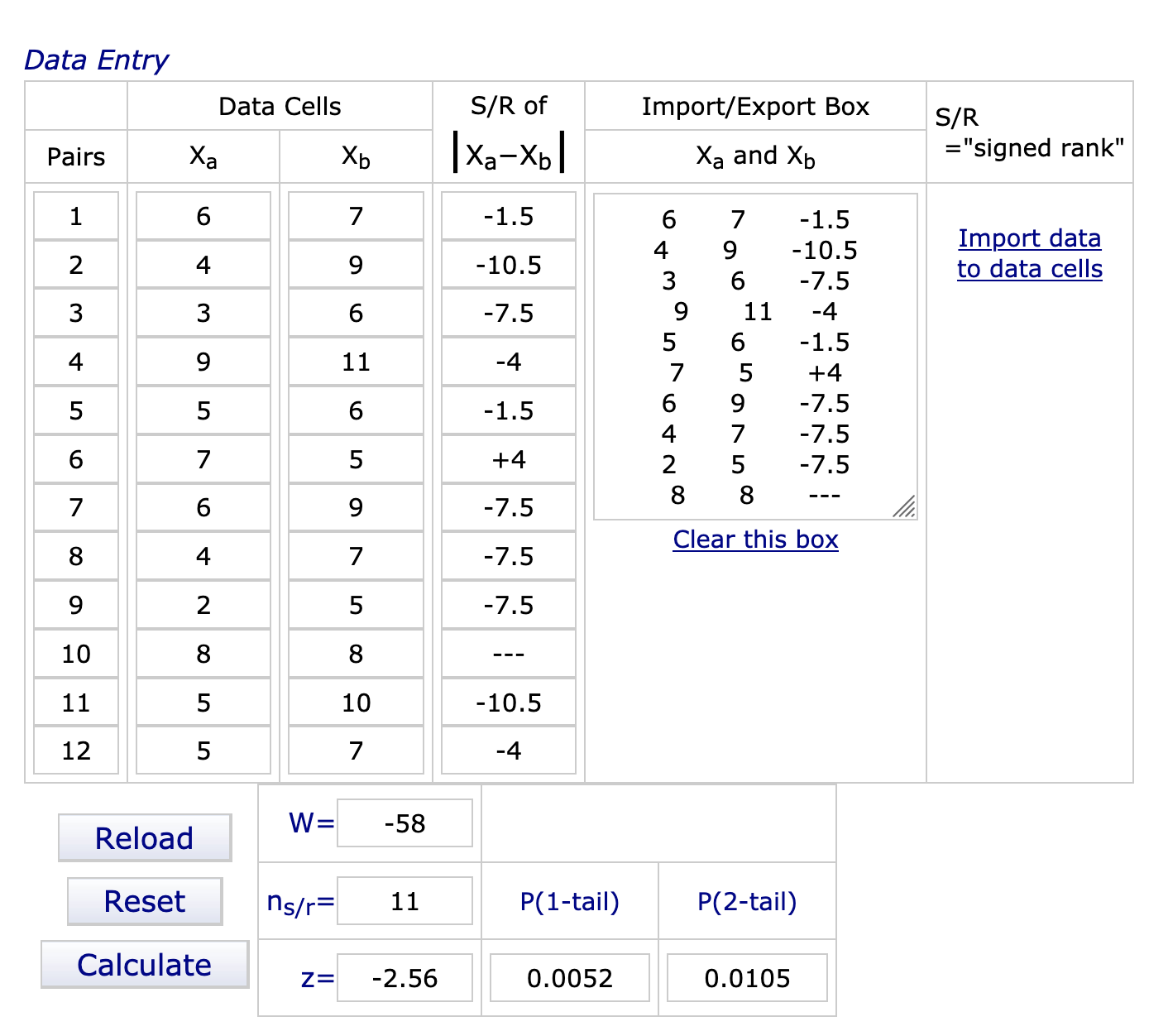 To calculate the level of significance, we can use the program Vasserstats.net. To calculate the Wilcoxon signed ranks test, click on "Ordinal Data" in the left-hand margin.