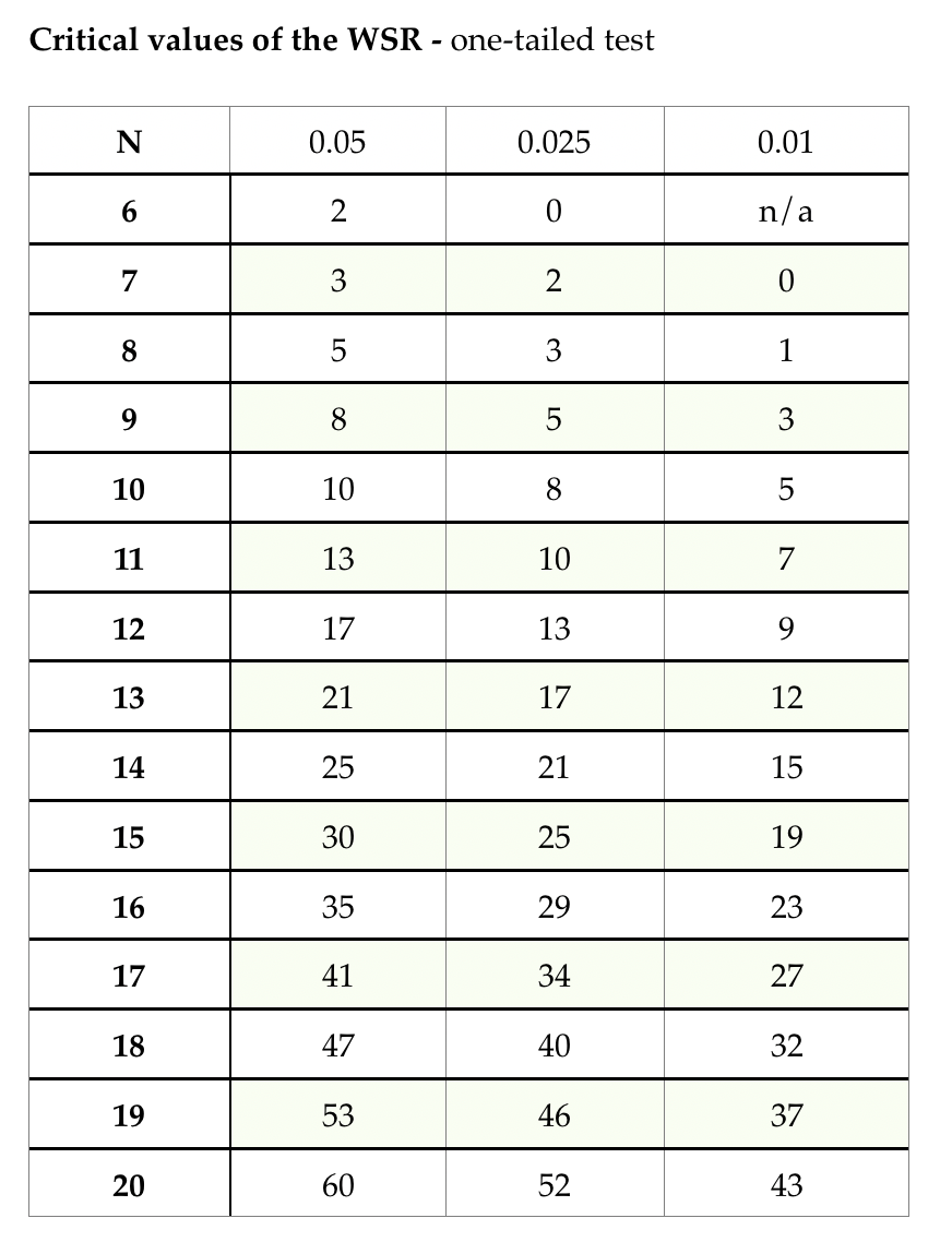 To use the critical values table, we use the T value, which is either the sum of the positive or the negative ranks - whichever is smaller. In this case, T = 4. The sample size (n) is equal to the total sample minus any participants who had no difference between the conditions. For this study our n = 11.