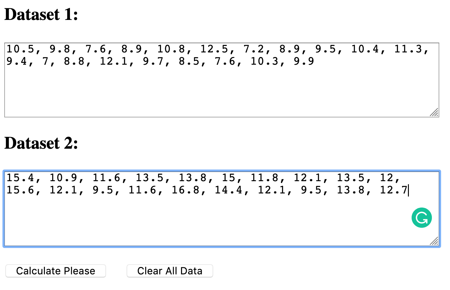 When you click on the link, enter your data for each group into the boxes, separating the data by commas. Your data entry should look like the image below.