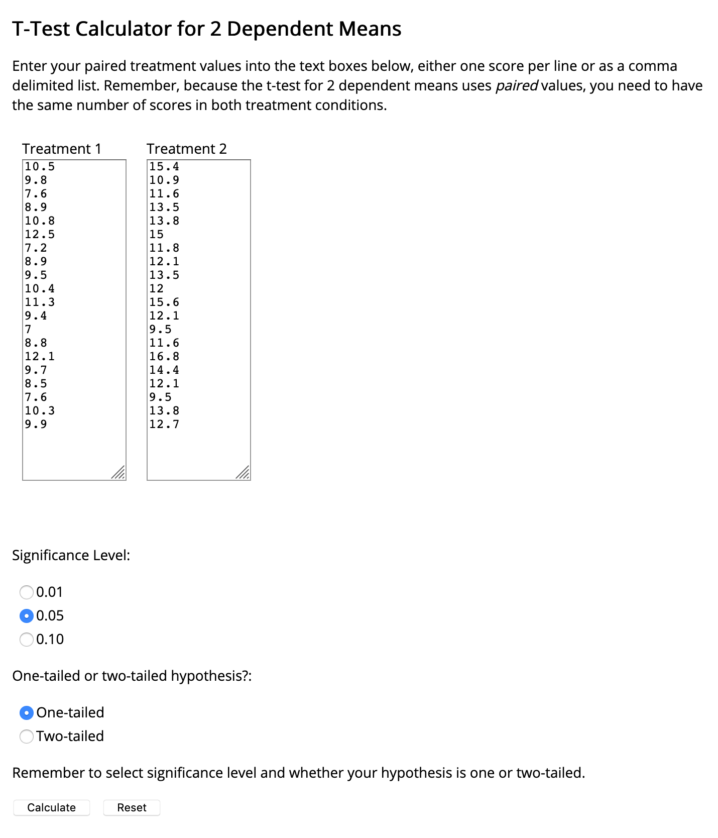 The t-test is quite a complex test to calculate by hand. For this page, we will use the calculator on Social Science Statistics to determine the p-value of the data above.