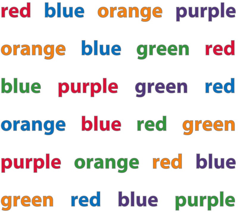 In this replication of the study, there are two conditions. In condition 1 (T1), participants were asked to read the list of words in the image to the left. In this case, there was no cognitive interference. In condition 2 (T2), the participants were asked to name the "colour of the word." This task has a high level of cognitive interference. The task of reading is an associative task - that is, it is our normal inclination to read a word, not identify its colour!