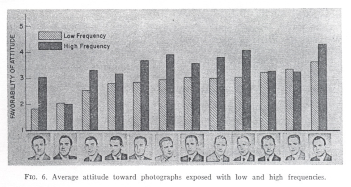 As you can see, when the participants were exposed to the image more frequently, their rating of the likeability of the man in the photo was significantly greater than when they had only seen the image once.