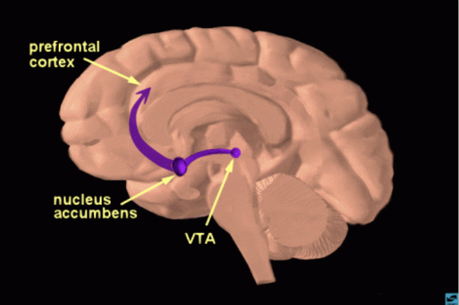 Nicotine binds to receptors in a region of the brain called the ventral tegmental area (VTA). These neurons trigger the release of dopamine in the nucleus accumbens (NAc).