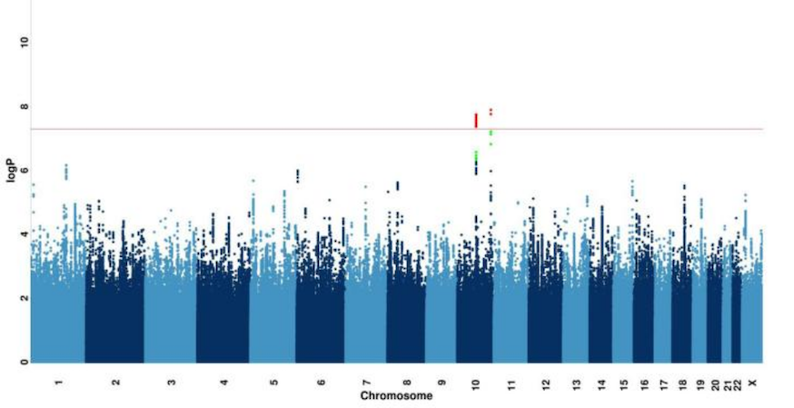 Cai et al (2015) analysed DNA sequences from 5,303 Chinese women with depression and 5,337 controls. In this GWAS, researchers found genetic sequences that seemed to be linked to depression. One of those sequences was in the area of a gene which is important for energy-producing cell structures called mitochondria. The correlations were confirmed in another set of more than 3,000 depressed men and women and over 3,000 controls. The Manhattan plot for this study is below.