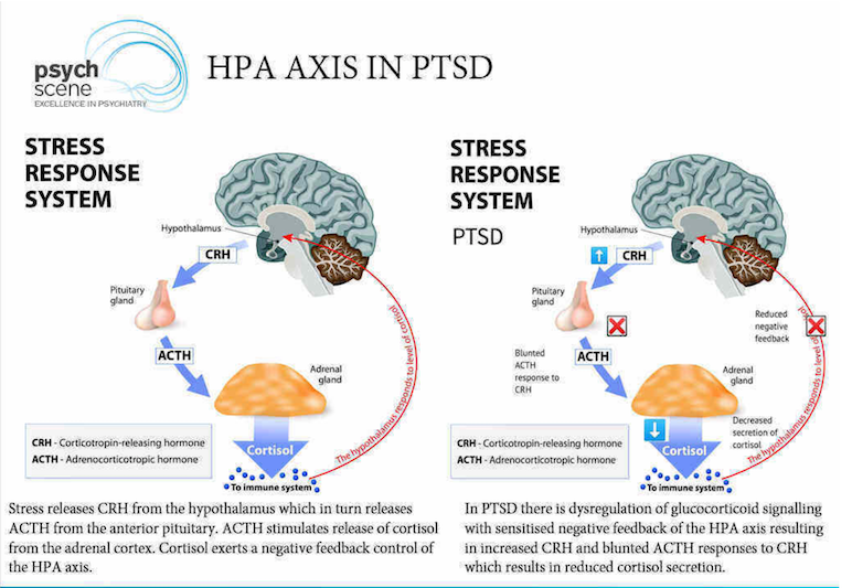 Researchers believe that it is the failure of this negative feedback loop that leads to stress-related problems - including PTSD. Although the video above explains the effects of high levels of stress on the brain, it is also a problem when we have low levels of cortisol. As you can see in the diagram below, it is actually "low" levels of cortisol secretion during stress which means that the HPA axis is not regulated that leads to the problem. It is hypothesized that either there is a genetic link to this dysfunction of the negative feedback loop, or it is the direct result of the stress which was caused by the trauma.
