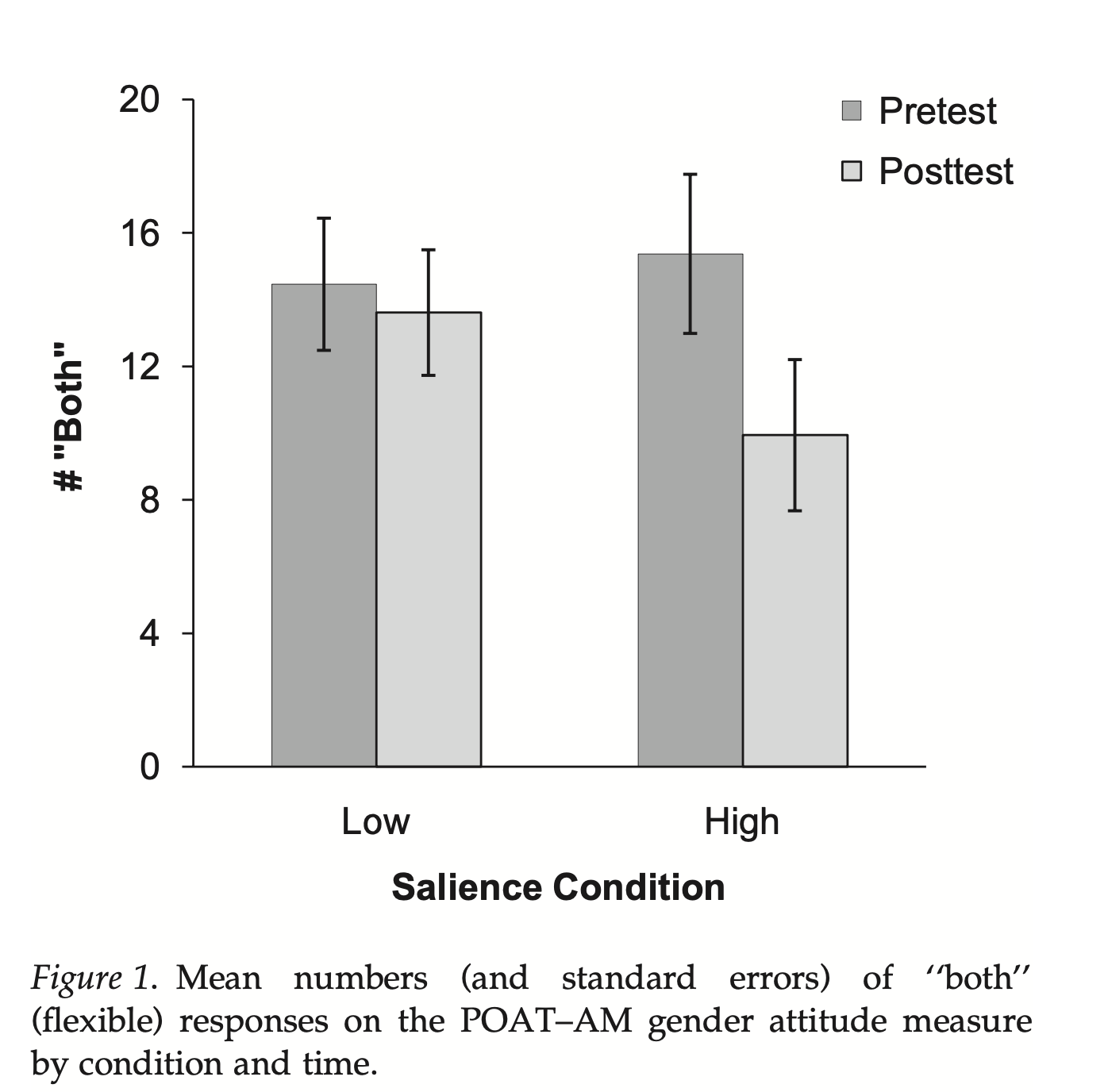 In this first graph, you can see that in the pre-test, both groups had a similar number of "both" responses when looking at images of activities/occupations on the POAT-AM gender attitude test. However, after the two-weeks of high gender salience, there was a significant decrease in the number of "boths" - meaning that the children had more gender stereotypes.