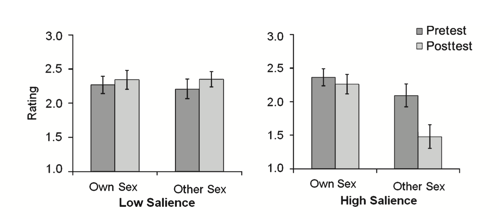 After two weeks, children in the high salience condition showed significantly increased gender stereotypes and decreased play with other-sex peers.