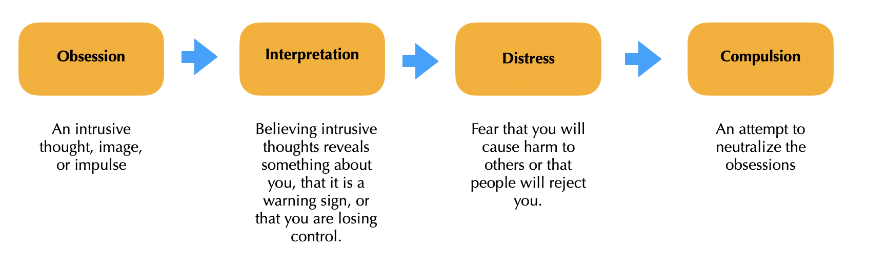 Everyone finds their mind wandering occasionally. Being distracted by our thoughts is a common experience, but people with OCD experience intrusive thoughts that are more intense, insistent, distressing, and longer-lasting than the usual interruptions faced by those without OCD. Most cognitive psychologists agree that although we may be unable to control the initial generation of such thoughts, there are individual differences in terms of the further processing that is conducted and people’s subsequent behavioural responses.