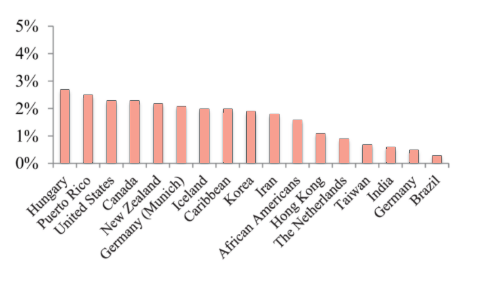 Which of the following statements does not explain variations in prevalence rates between countries, e.g. Hungary (2.7%) and Brazil (0.3%)?