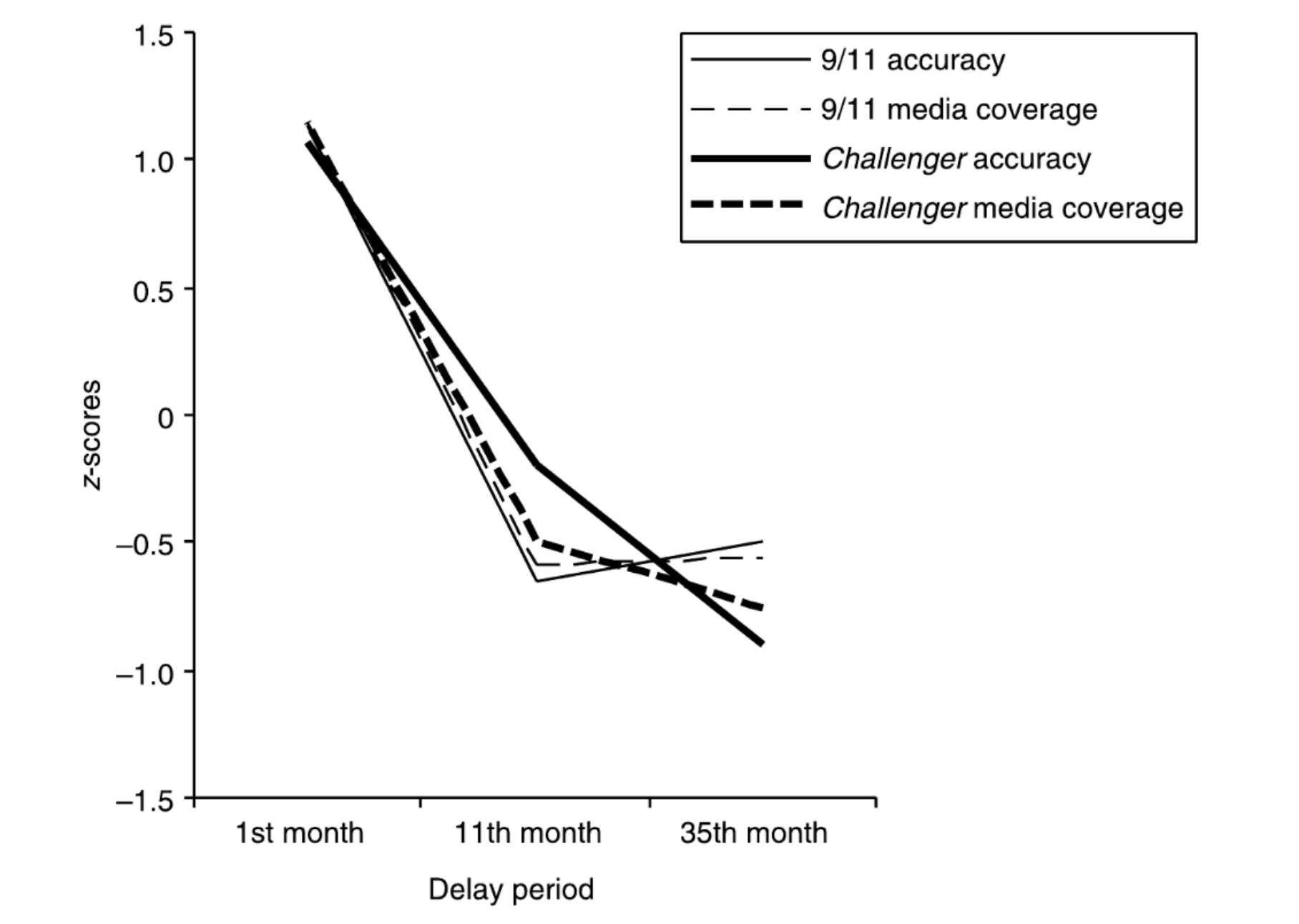 As you can see from the graph to the left, there was a higher level of accuracy in the 9/11 memories; however, there was also more media coverage of the 9/11 attacks over the three years following the event.