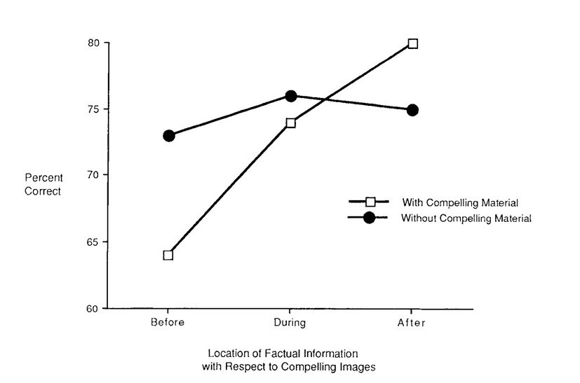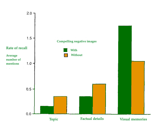 As you can see from the graph on the left, recognition of factual information was less correct for material before the compelling images than the material before the non-compelling images. It appears that the emotive nature of the images impaired recall of this information.