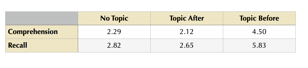 The sample was made up of 52 participants. They were allocated to one of three conditions. In the No Topic group (n = 17), participants heard a passage with no additional information. In the Topic After group (n = 17), participants were told the topic of the passage after hearing it. In the Topic Before group (n = 18), participants were told the topic of the passage before hearing it.