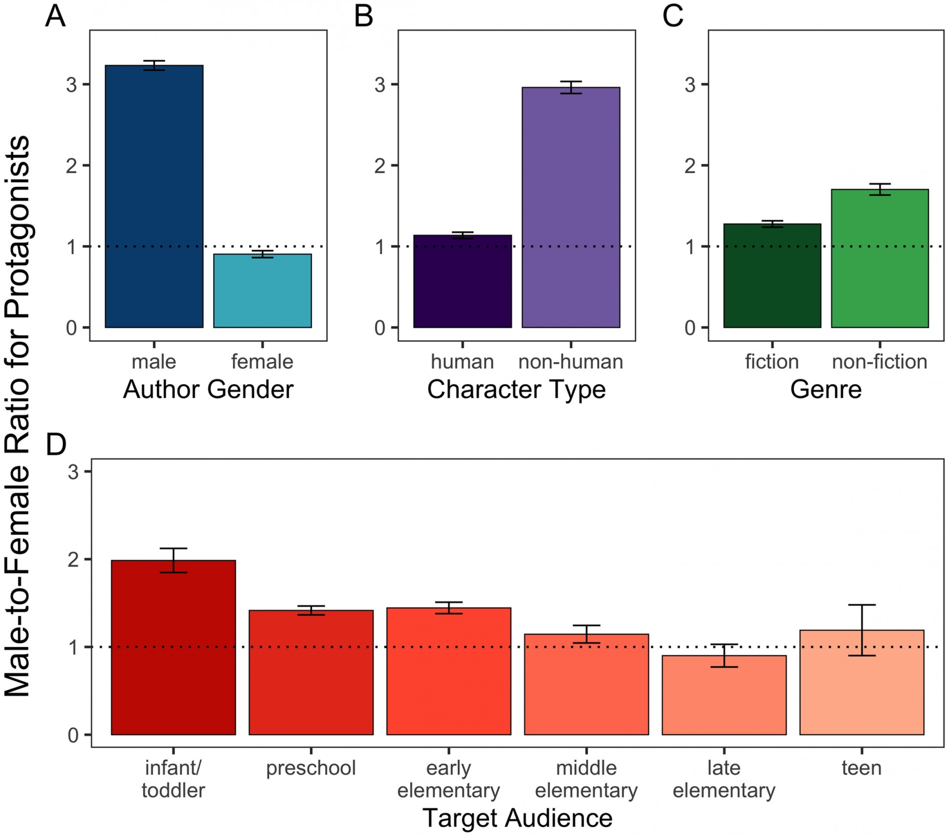 * Male authors showed improvement in the male-to-female ratio of central characters across the 60-year period, but this was limited to books targeted to younger children.