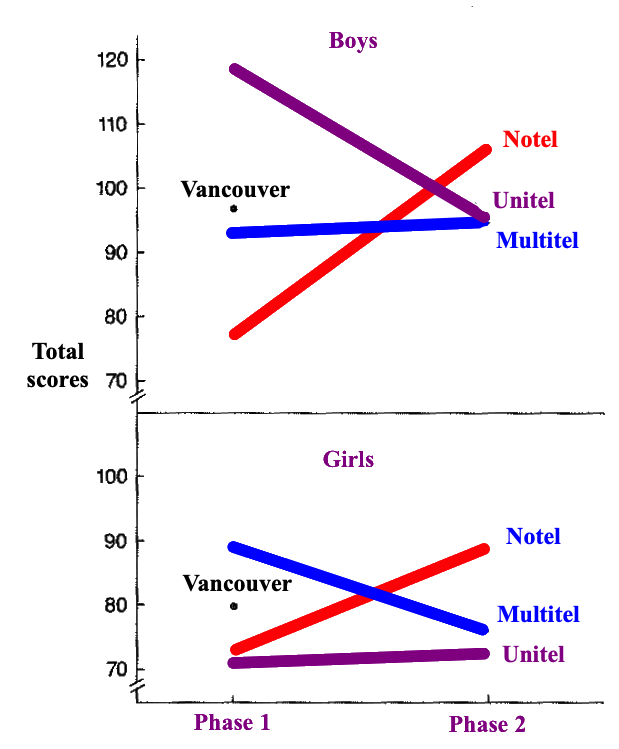 The participants were 536 children in four different communities. The sample consisted of 130 children from Notel (that is, No Television), 135 from Unitel (one station), 166 from Multitel (more than one station), and 105 from Vancouver. Both Unitel and Multitel were from the same geographic region. Vancouver was used as a control.