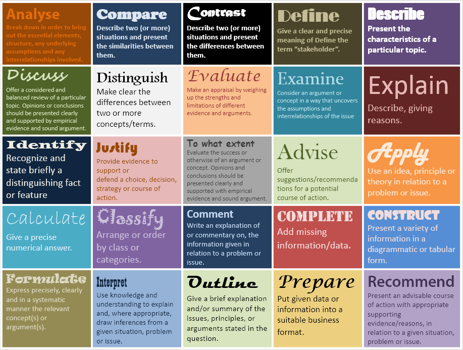 | Contrast | The opposite meaning of "Compare" but requiring the same transferable skills, contrast means to give an account of the differences between two (or more) things. It requires students to refer to both (all) of these issues / situations / items throughout the answer, such as contrasting the organizational objectives of for-profit organizations and non-profit social enterprises, or the marketing mix of these different types of organizations. |