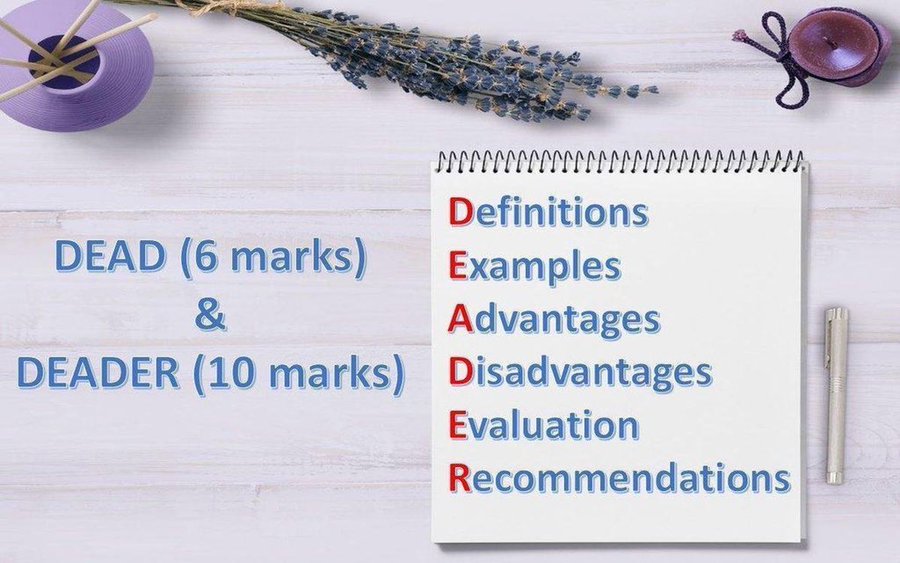 This is a top tip for writing answers to 6 and 10 mark questions, respectively: the DEAD and DEADER principles. Students can use this as a framework for their extended response answers in both Paper 1 and Paper 2.