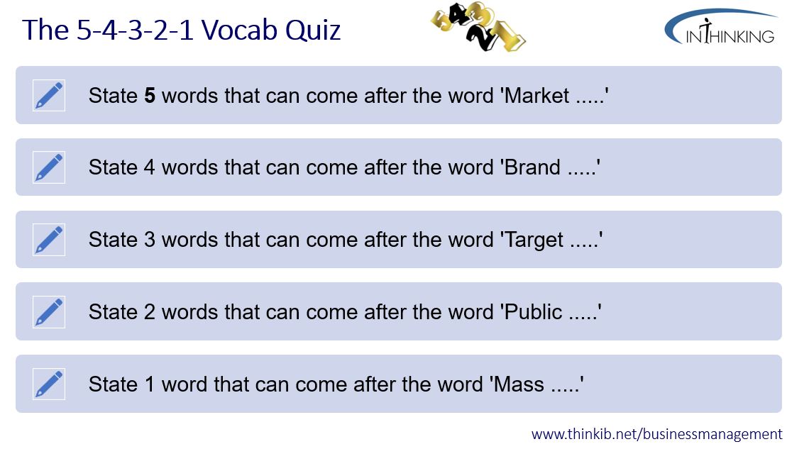 Keep a glossary of key terms from the IB Business Management course - Too often, students are imprecise with their definitions. As your students work through the IB BM course, get them to keep a glossary of new key terms or phrases – written in their own words. The glossary can be update when you introduce new tools, theories and techniques from the syllabus.