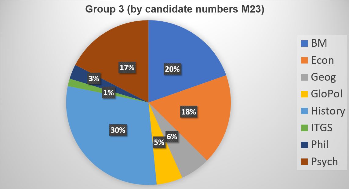 The table below from the IB shows the number of candidates that took examinations in the given Group 3 subjects.