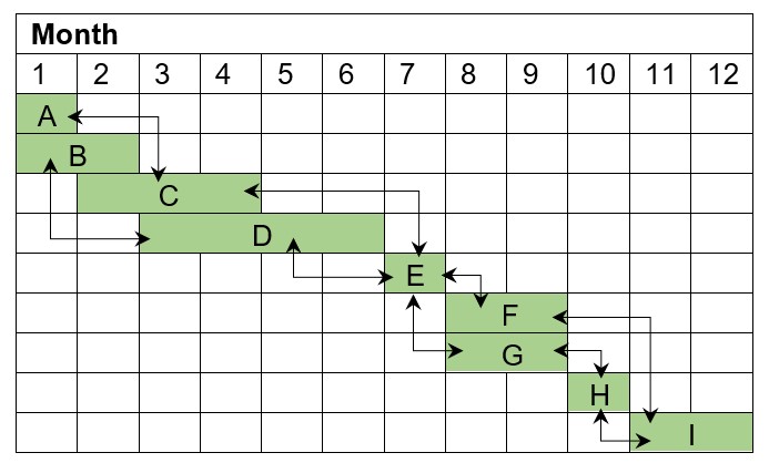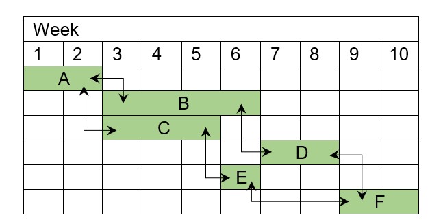 Note that the project, when presented in the format a Gantt chart shows the project can be completed in 17 weeks. If the tasks were done individually without planning, the sum of the separate tasks equals 20 weeks.
