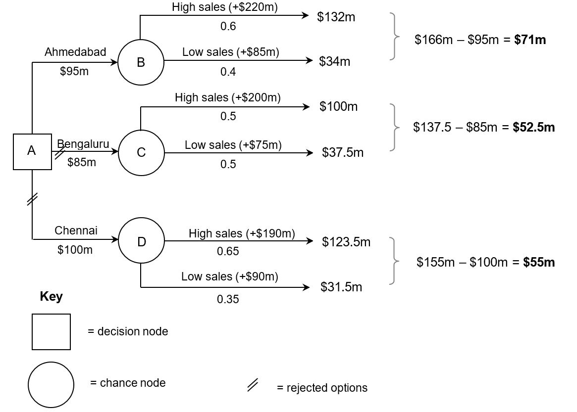 Award [3 - 4 marks] if the main elements of the decision tree are constructed, but may not be entirely accurate or the working may not be shown. For [4 marks], the calculations for each option are largely correct and presented clearly.