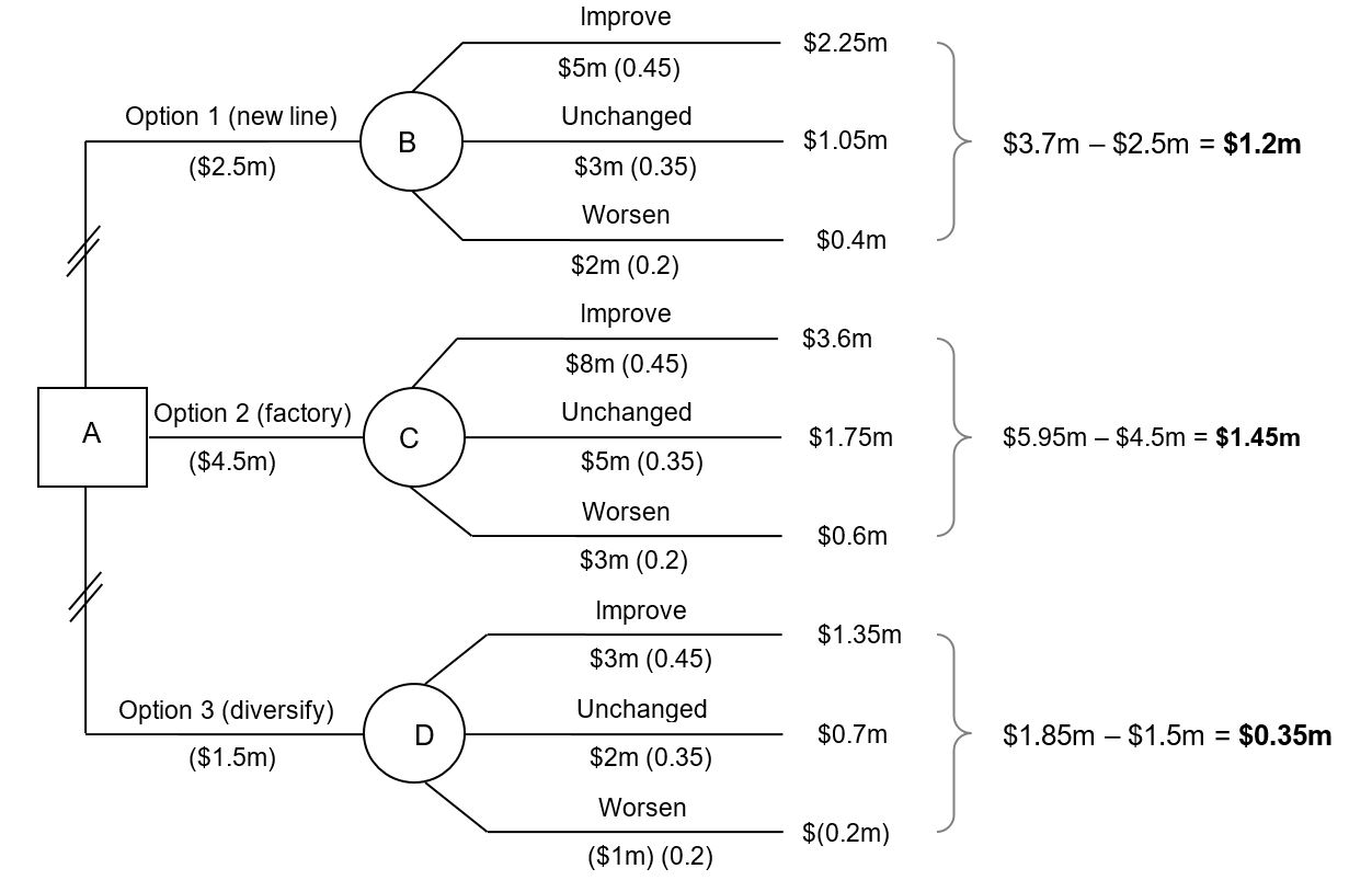 Award [3 to 4 marks] if the main elements of the decision tree are constructed, but may not be entirely accurate or the working may not be shown. For [4 marks], the calculations for each option are largely correct and presented clearly.