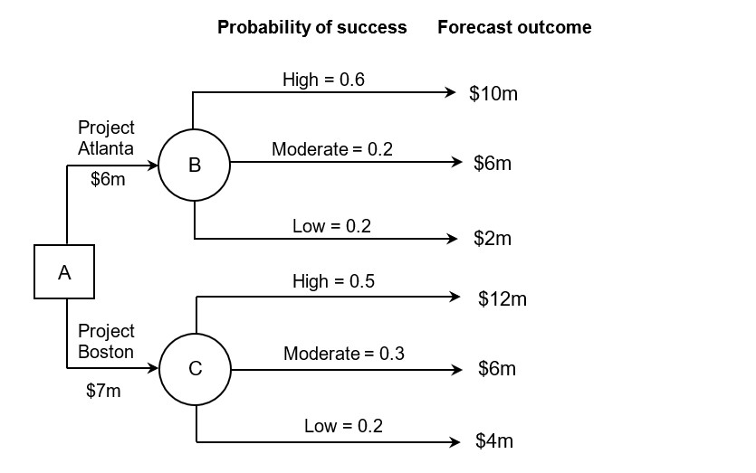 The decision tree analysis shows that both projects are expected to yield the same financial return of $1.6m. In theory, this means either projects are feasible on quantitative grounds. In reality, Project Atlanta may be preferable given the cost of the project is $1m less, and given that there is a lower chance (probability) of success for Project Boston (which costs 16.7% more to invest in than Project Atlanta).