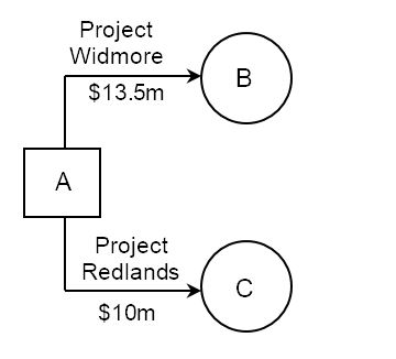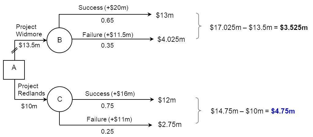The diagram below shows a decision of a firm to invest in either Project Widmore (which costs $13.5m) or Project Redlands (which costs $10m).