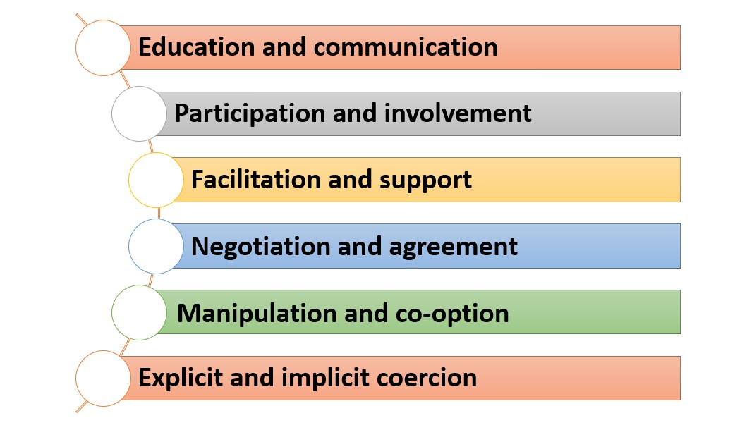 This approach to change management aims to inform and educate staff (and other stakeholders) about the change beforehand. Early communication and clarification can help stakeholders to see the rationale for change and establish trust. Perhaps more importantly, this approach reduces any unsubstantiated claims and rumours about the proposed change. Hence, this helps to limit misinformation and misunderstanding (one category of Kotter and Schlesinger's reasons for resistance to change).