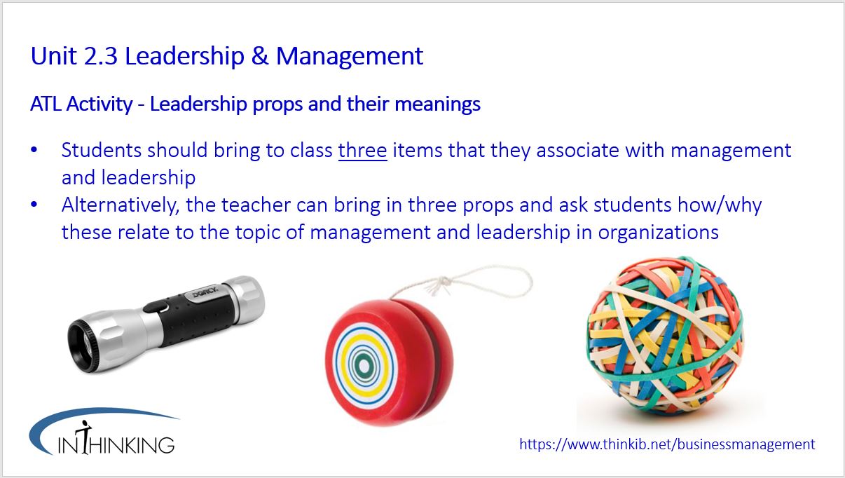 Asking students to bring to class three items that they associate with management and leadership as a topic in the IB Business Management syllabus.