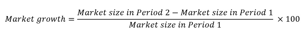 The most common way to calculate market growth, is to work out the percentage change in the market size in two different time periods (see worked example). The formula for calculating market growth is: