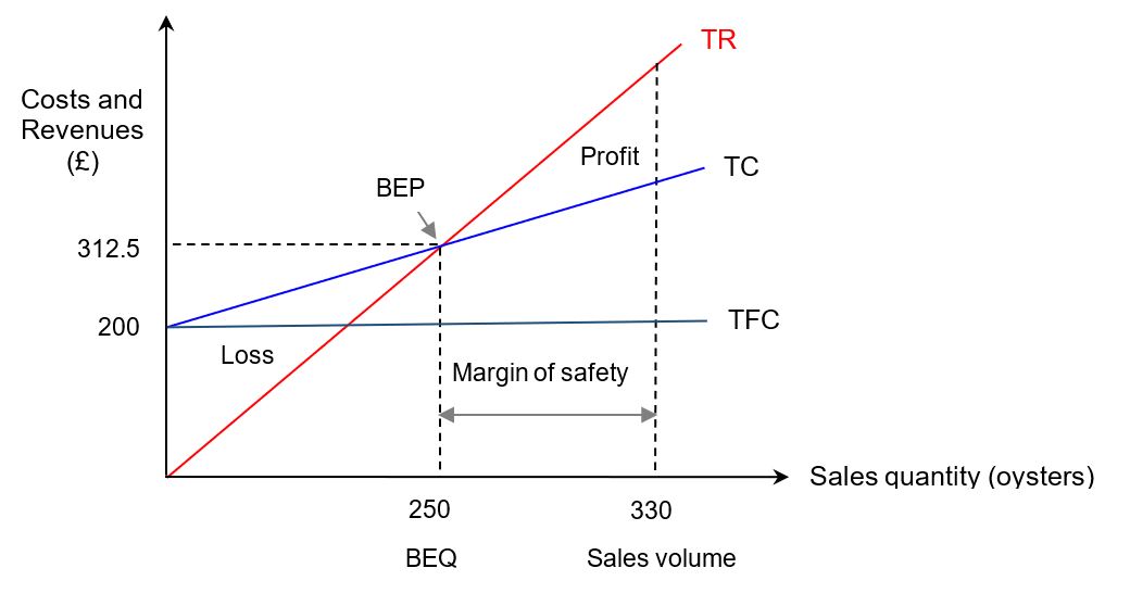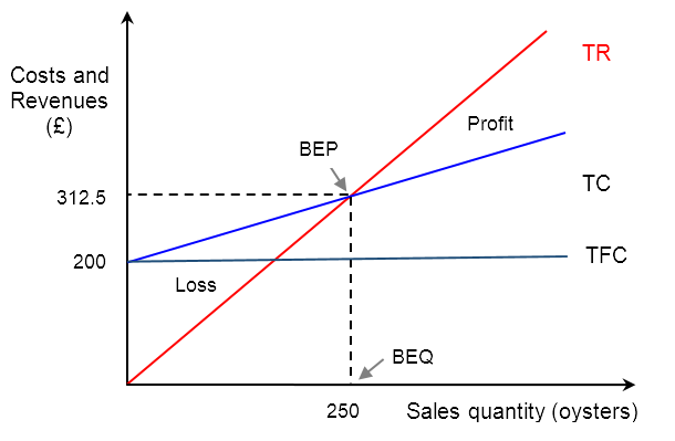The break-even revenue is shown on the y-axis, representing the value of the output needed to break-even. If the firm sells 250 oysters (the BEQ), the break-even revenue is £312.50 (i.e. £1.25 × 250).